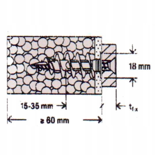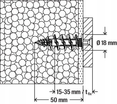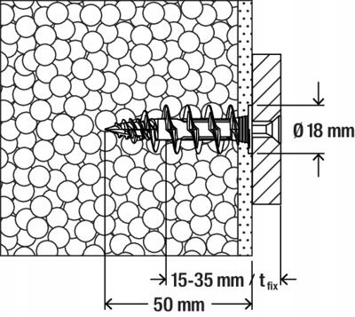 - Dzięki specjalnej geometrii końcówki kołek wkręca się w tynki o grubości do 10 mm bez wstępnego nawiercania, co umożliwia szybką instalację.