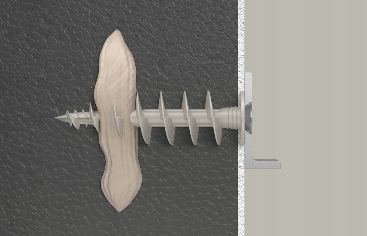 - Kołek mocno zakotwicza się w materiale izolacyjnym, nie niszcząc tynku.