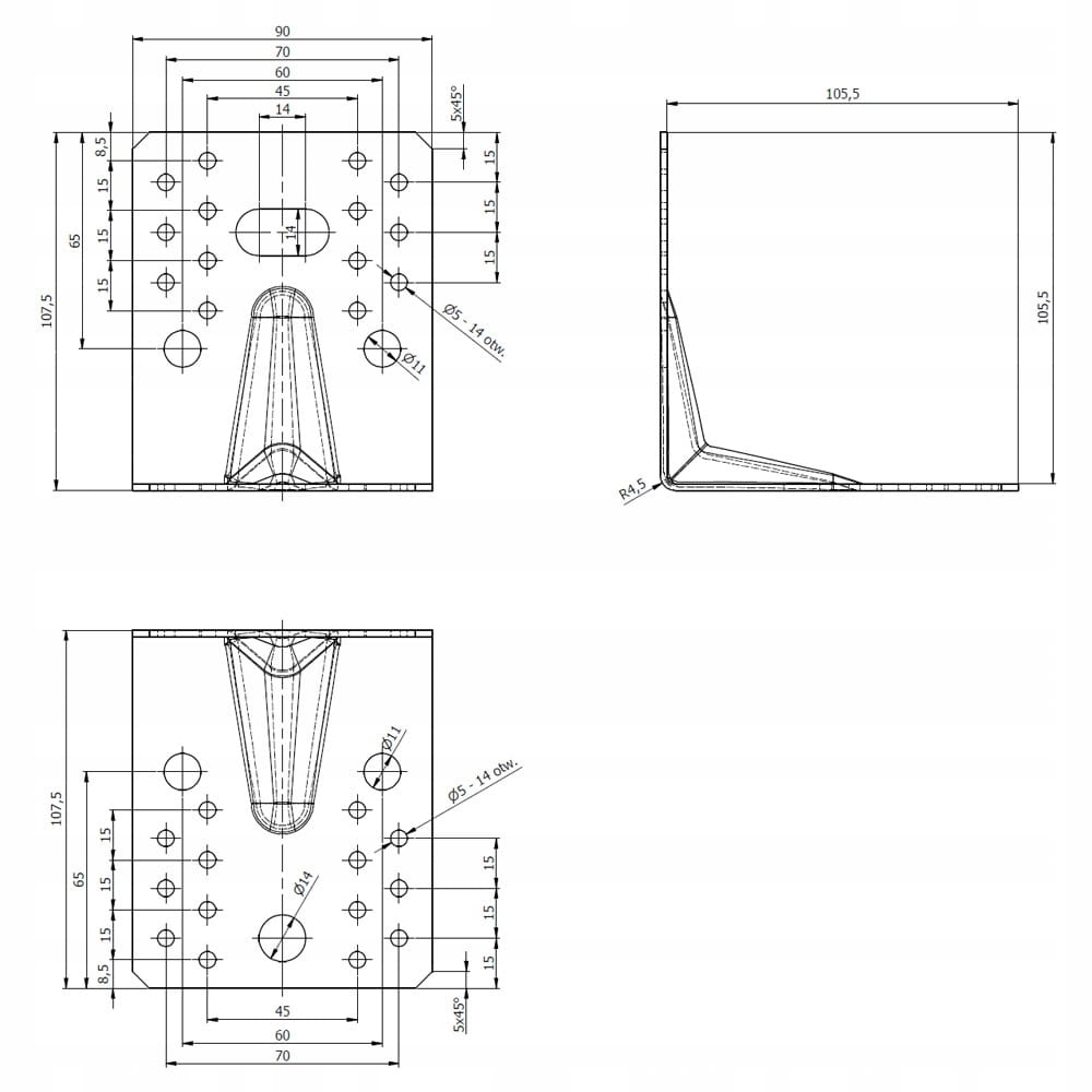 - ilość otworów -28 otworów ø5mm, 4 otwory ø11mm, 1 otwór ø14mmx28mm