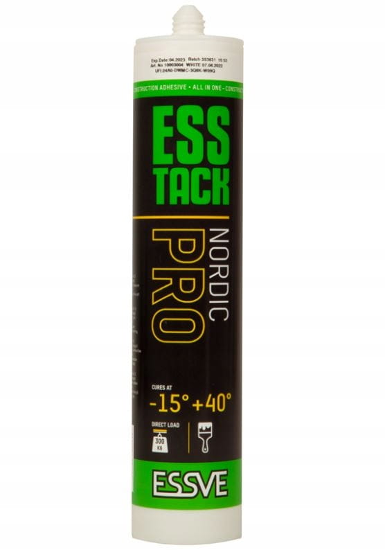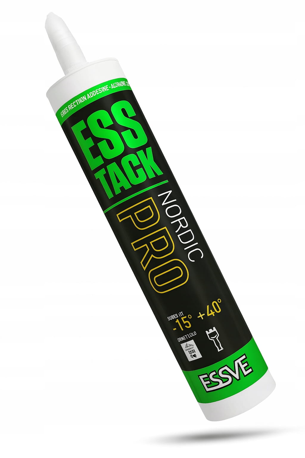 ESSTACK NORDIC PRO to bardzo mocny i szybko wiążący klej montażowy o dużej nośności. Może być stosowany w temperaturach poniżej 0°C, (testowany do -15°C). Odporny na warunki atmosferyczne klej o dużej elastyczności, na bazie polimeru hybrydowego. Nie uszkadza wrażliwych materiałów, takich jak plastik komórkowy lub szkło lustrzane. Można malować. Przechowywać w pozycji pionowej w temperaturze maks. +25°C.