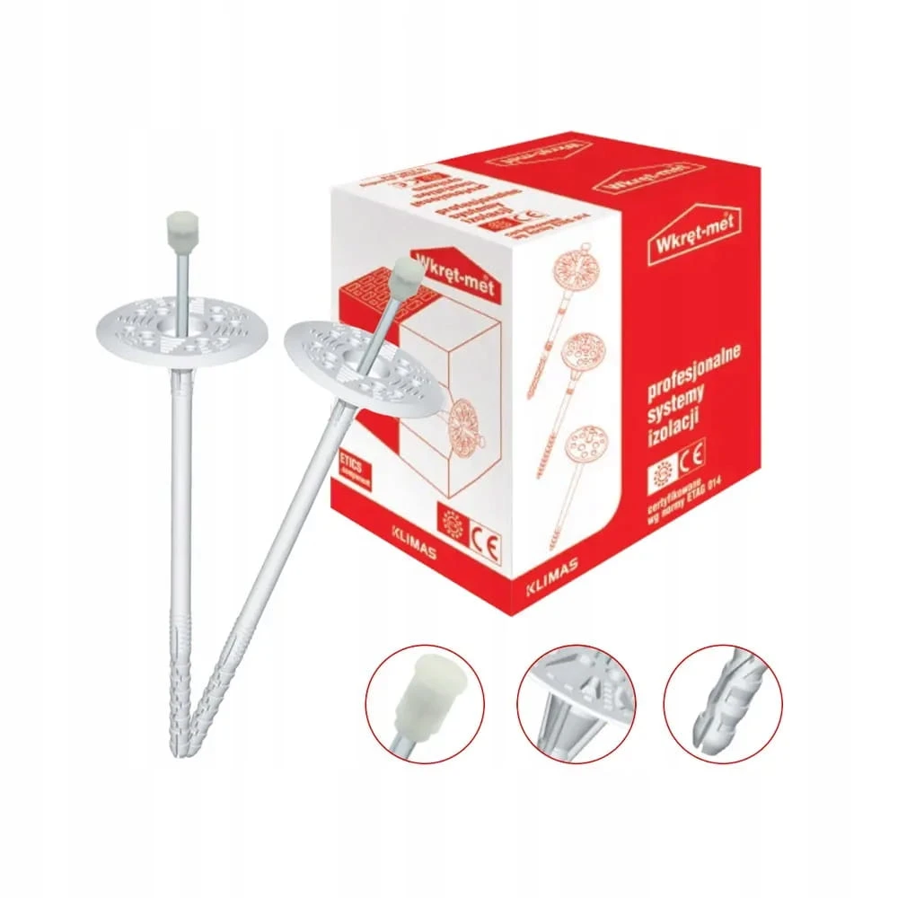 - Główka trzpienia metalowego pokryta tworzywem. Zmniejszona punktowa przewodność cieplna poprawia współczynnik przenikania ciepła całej przegrody, dodatkowo zabezpiecza trzpień przed korozją.