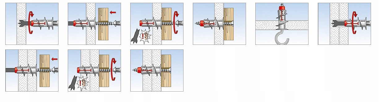 - Kołki DUOBLADE mogą być stosowane z wkrętami do drewna, metalu i płyt wiórowych o grubości od Ø4,0 do Ø5,0 mm oraz różnymi zakończeniami hakowymi i oczkowymi.