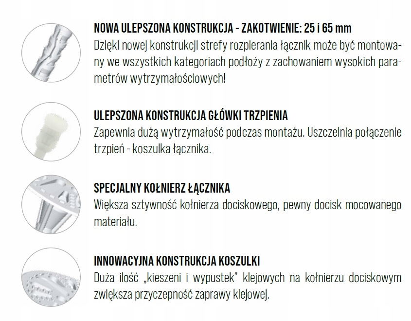 - Nowa, ulepszona konstrukcja strefy rozpierania. Dzięki niej łącznik może być montowany we wszystkich kategoriach podłoży z zachowaniem wysokich parametrów wytrzymałościowych.