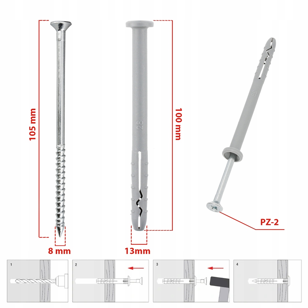 - Średnica (dw) i długość wkręta (Lw): 4,9 mm x 105 mm