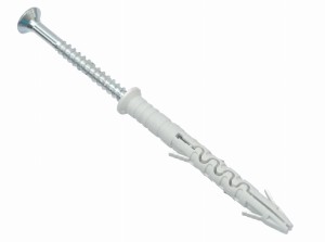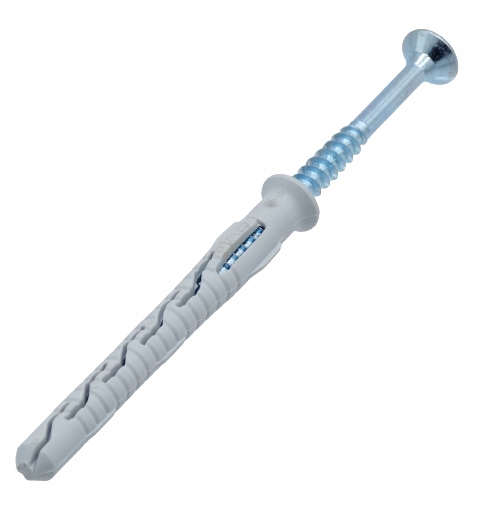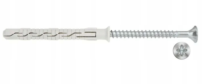 Kołek ramowy rozporowy tworzywowy z wkrętem z łbem stożkowym i gniazdem PZ do montażu poprzez element mocowany do wielu podłoży