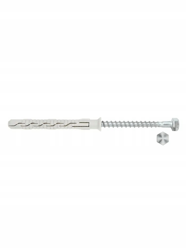 Kołek ramowy rozporowy tworzywowy z wkrętem z łbem sześciokątnym do montażu poprzez element mocowany do wielu podłoży.