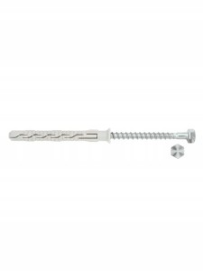 Kołek ramowy rozporowy tworzywowy z wkrętem z łbem sześciokątnym do montażu poprzez element mocowany do wielu podłoży.