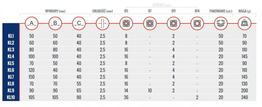 Łącznik, kątownik budowlany montażowy KL5 70x50x40x2,5mm 1szt.