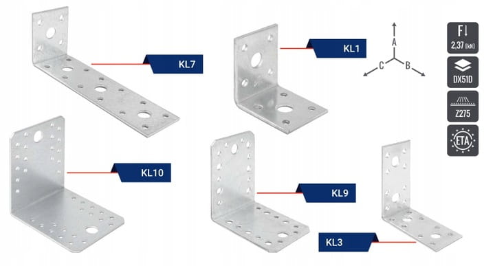 Kątowniki są wykonane ze stali gatunku DX51D lub S250GD z ogniową powłoką cynkową Z275, co zapewnia im odporność na korozję oraz lokuje wyrób w 1 i 2 klasie użytkowania (wg EUROKOD 5).