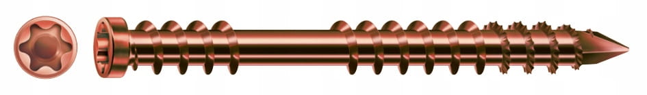 - główka cylindryczna – zapewnia szczelne „osadzenie” w desce tarasowej minimalizując „zagniecenia” włókien drewna wokół główki wkręta, cylindryczny kształt zapewnia mniejszą widoczność główki wkręt w porównaniu do typowej stożkowej główki,