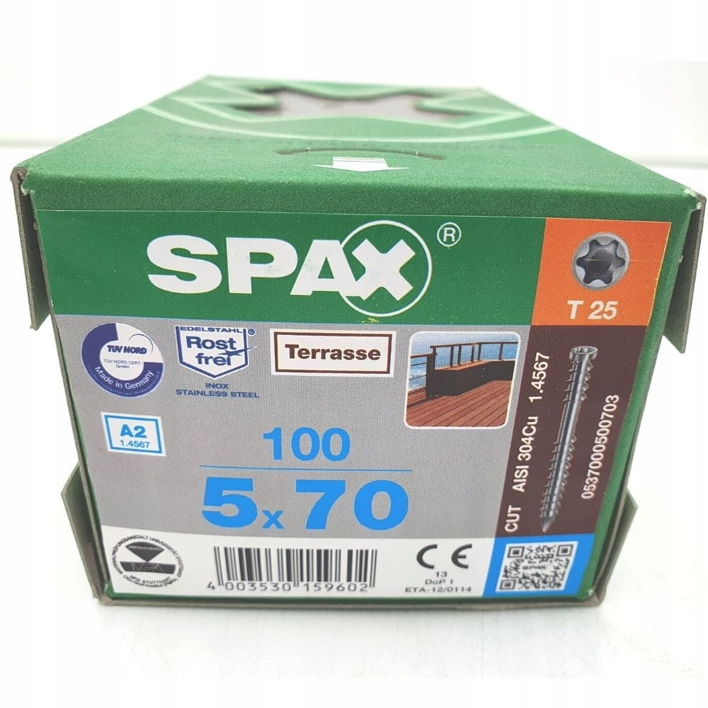 ✅ Do konstrukcji tarasu potrzebne są niezawodne materiały. Wkręty tarasowe SPAX wykonane są ze stali nierdzewnej (A2, A2 w kolorze starego złota lub A4), co czyni je odpornymi na warunki atmosferyczne.