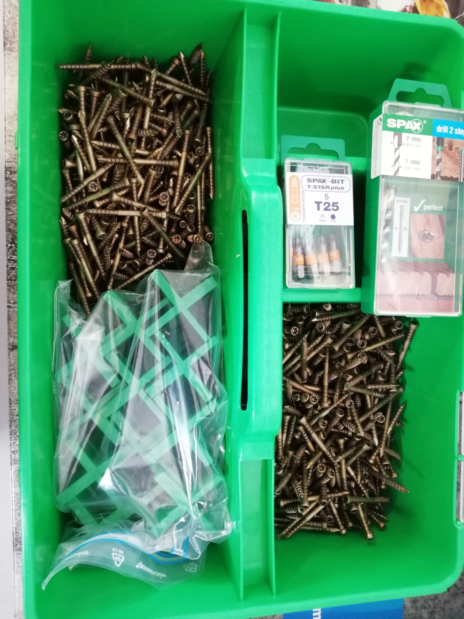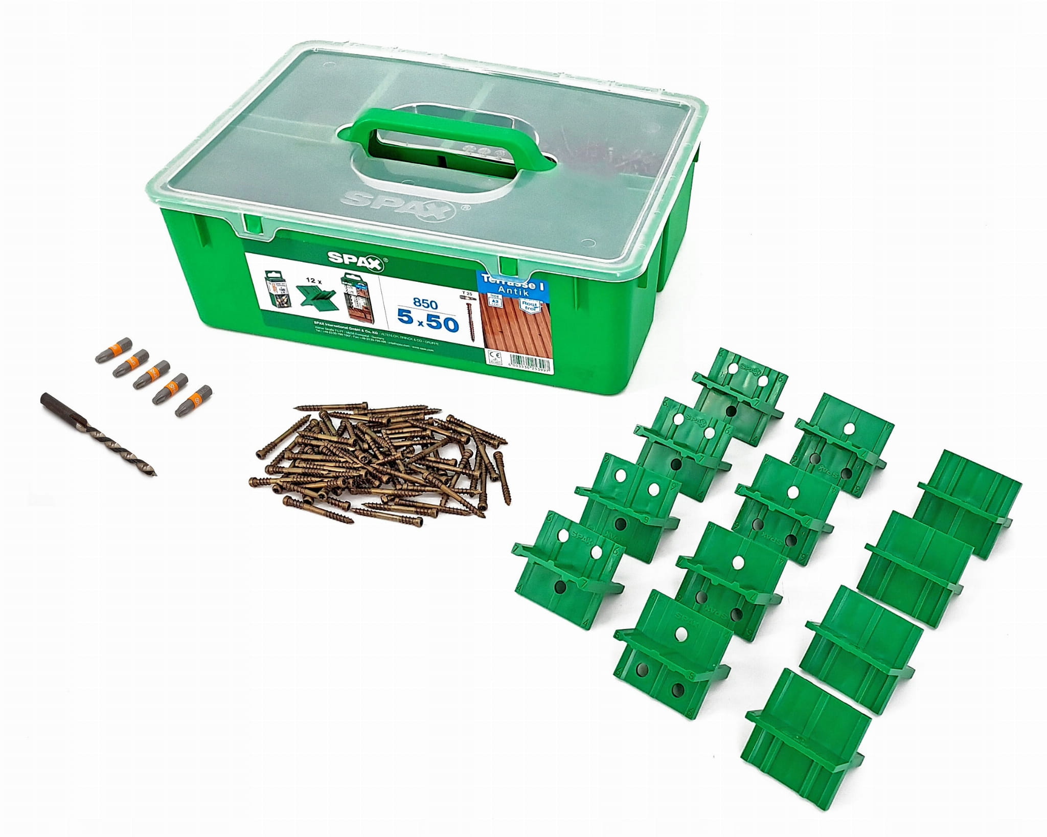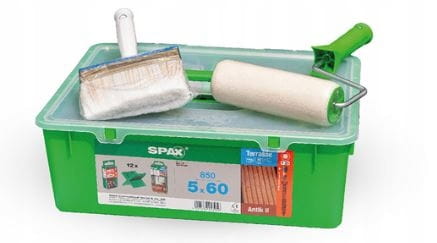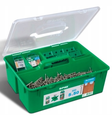 Zestaw tarasowy SPAX GREEN Box Tarasy 5x50 mm to zestaw przeznaczony zarówno do montażu deski z drewna rodzimego jak i egzotycznego o maksymalnej grubości 30 mm. Jego bazą są wkręty ze stali nierdzewnej A2 w kolorze stare złoto, które nie wymagają nawiercania w miękkim drewnie, natomiast jest ono zalecane przy drewnie twardym. Wkręty też cechuje również: