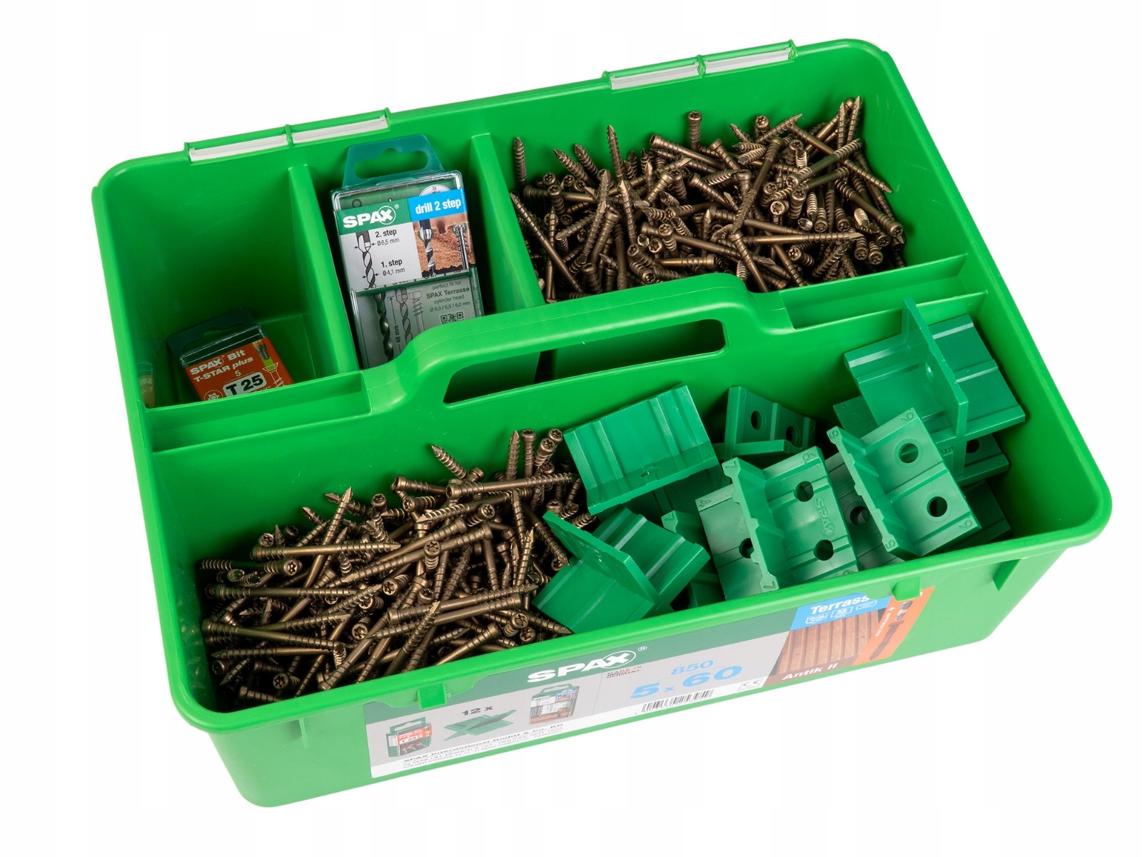 SPAX ZESTAW GREEN BOX WKRĘT TARASOWY 5x60 850SZT STARE ZŁOTO BIT WIERTŁO