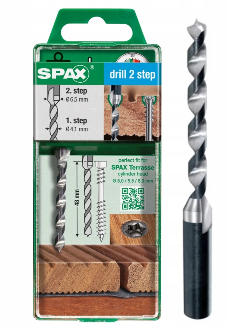 ✅ Drugi stopień o średnicy 6,5 mm jest wystarczający do pogłębienia łba cylindrycznego wkrętów do desek tarasowych równo z powierzchnią.