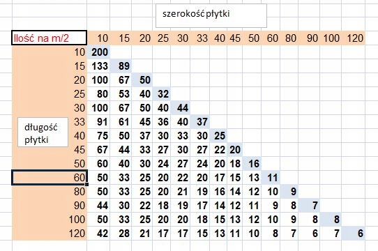W tabeli przedstawiono ilość zużycia klipsów na m2, przy danym rozmiarze płytek.