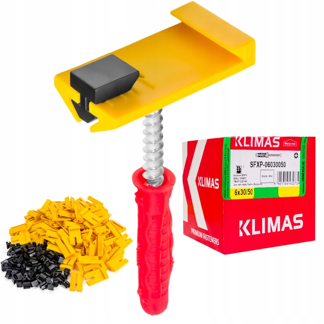 System mocowań do listew tynkarskich firmy TEVOTECH w zestawie z kołkami i wkrętami firmy Klimas.