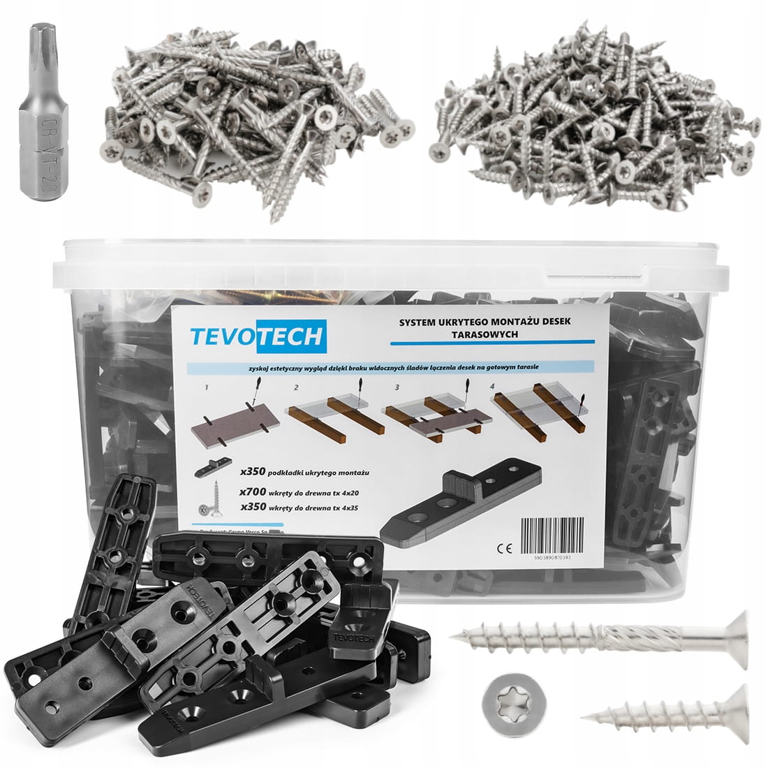 System ukrytego montaży desek tarasowych TEVOTECH + wkręty stal A2 1401 el.