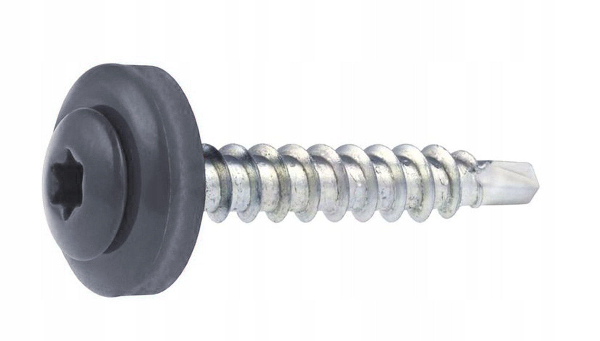 Wkręt samowiercący marki Wkręt-met z podkładką z EPDM wykonany w powłoce cynkowej do mocowania blach, blachodachówki i obróbek blacharskich do podłoża drewnianego.