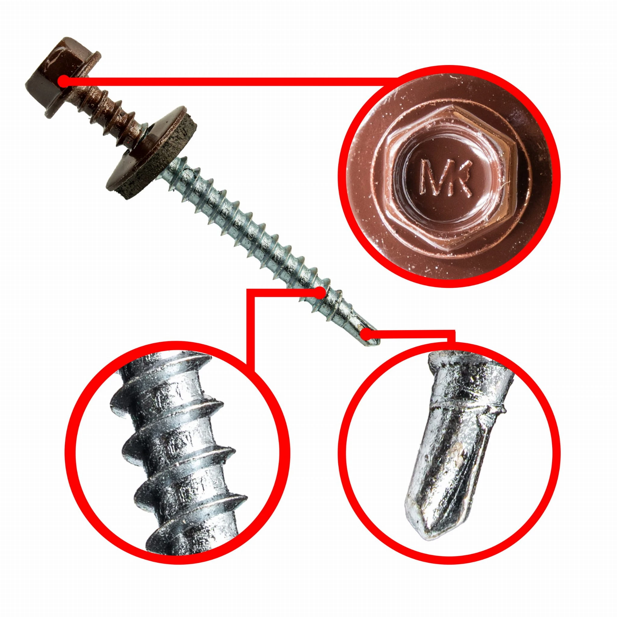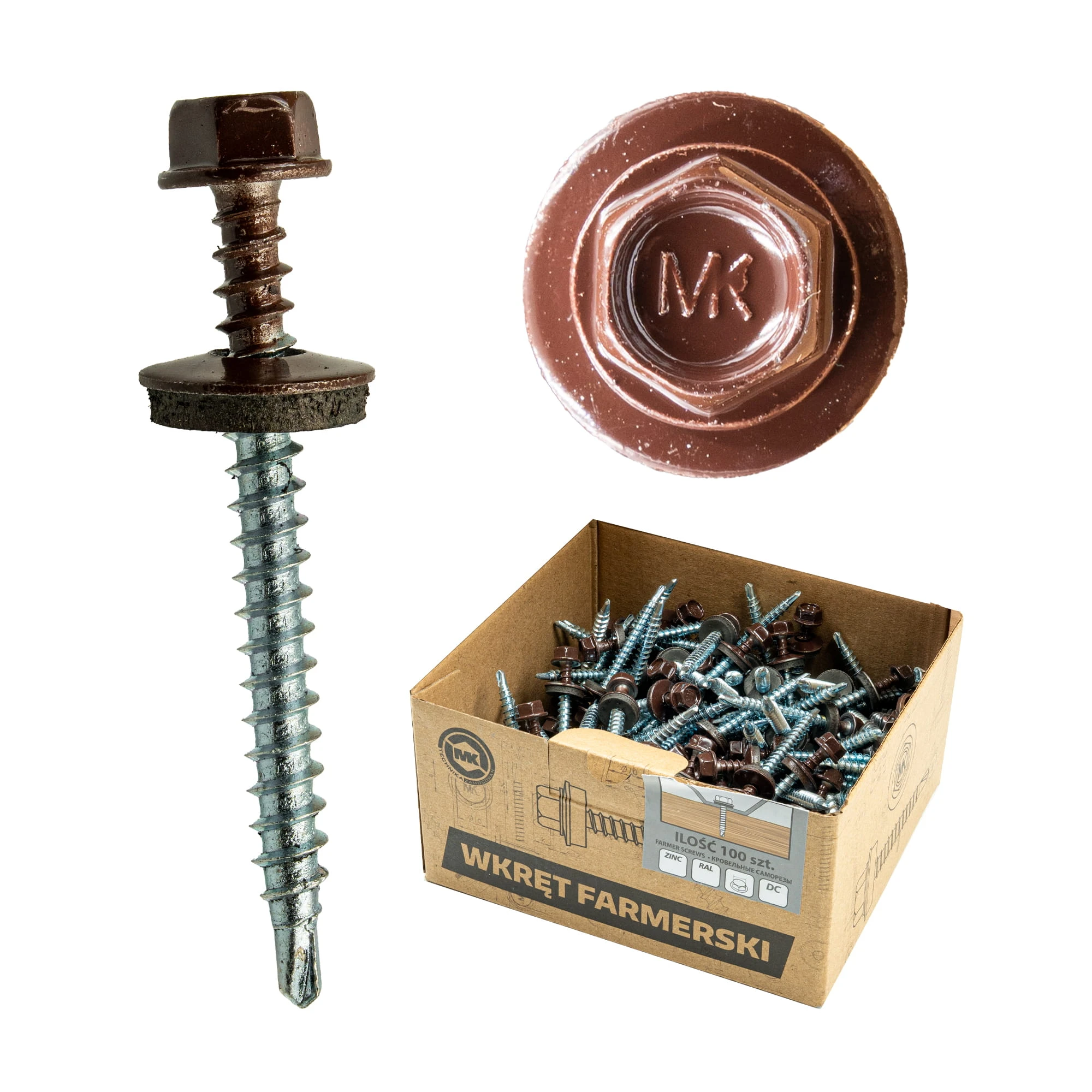 Wkręty farmerskie-samowiercące z podkładką EPDM wykonane w powłoce cynkowej do mocowania blachy, blachodachówek i obróbek blacharskich do podłoża drewnianego. Wkręty typu farmer lakierowane są wg. palety kolorów RAL