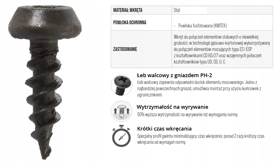 - Krótki czas wkręcania - Specjalny profil gwintu minimalizujący czas wkręcenia: 2,5 raza krótszy czas wkręcania od wymagań normy.