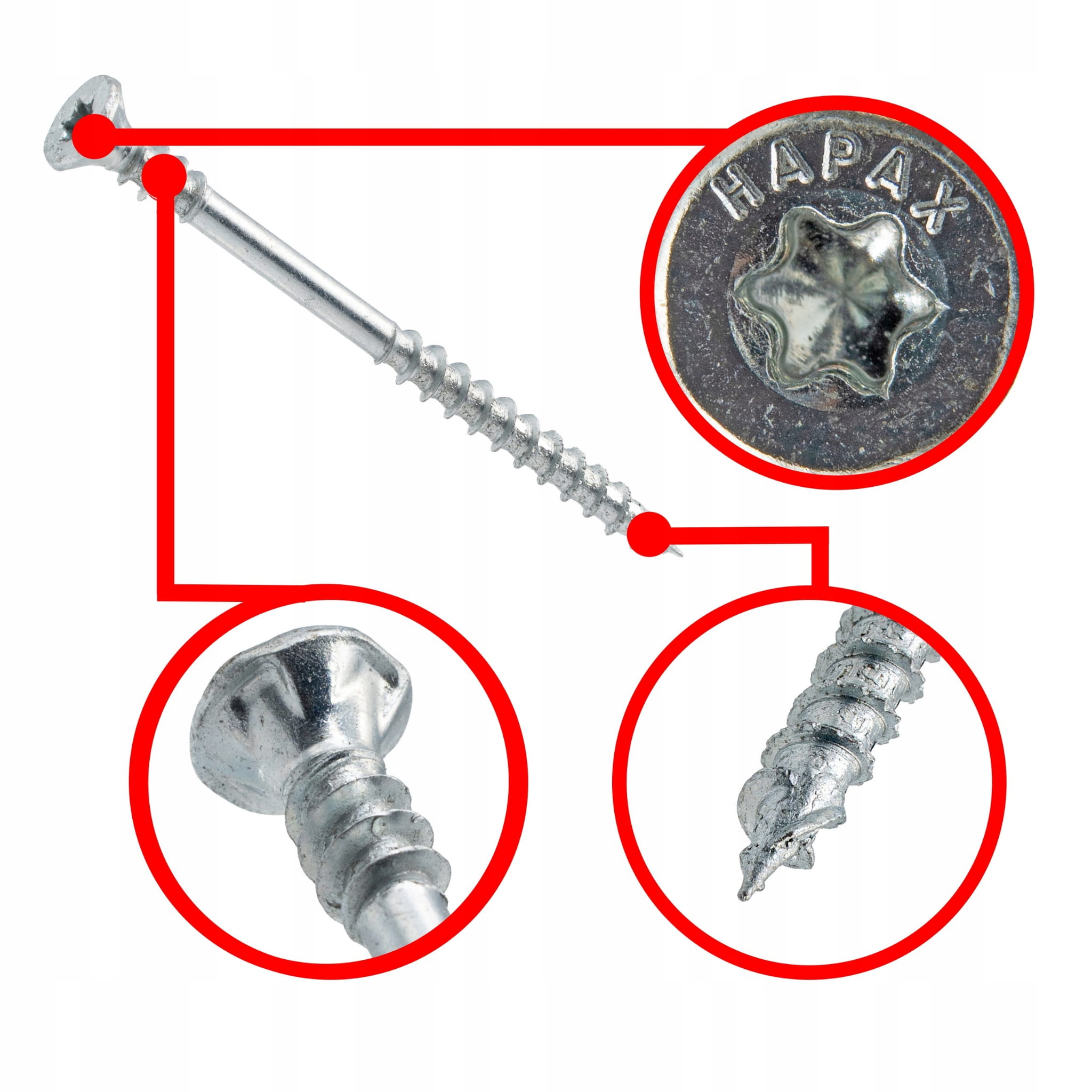 - Potrójny gwint Hapax – zmniejsza ryzyko rozłupywania drewna, umożliwia minimalne odstępy między krawędziami i panelami, co jest kluczowe przy precyzyjnym montażu mebli.