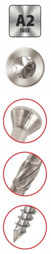 Wkręty tarasowe do drewna egzotycznego wykonane ze stali nierdzewnej A2 z gniazdem TX. Specjalna konstrukcja zapobiega pękaniu drewna. Główka pod kątem 60° wraz z karbami zapewnia prawidłowe jej osadzenie w materiale