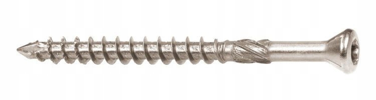 Wkręt do drewna egzotycznego. Specjalna konstrukcja zapobiega pękaniu drewna. Główka pod kątem 60° wraz z karbami zapewnia prawidłowe jej osadzenie w materiale. Gniazdo TX gwarantuje optymalne przeniesienie momentu obrotowego. Frez rozwiercający zmniejsza moment siły niezbędnej do wkręcania poprzez poszerzenie otworu. Specjalne karby tnące na gwincie przecinają włókna struktury drewna podczas wkręcania, a specjalny szpic ułatwia rozpoczęcia wkręcania oraz zapobiega rozwarstwianiu drewna.