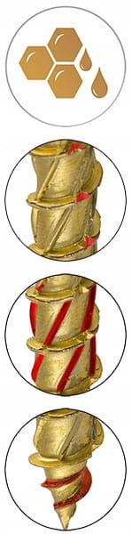 - Powłoka woskowa: specjalna powłoka woskowa nanoszona podczas procesu produkcyjnego znacząco zmniejsza moment potrzebny do wkręcania wkręta. Dzięki temu montaż jest szybszy i łatwiejszy, znacząco obniża zużycie energii co jest szczególnie istotne w narzędziach zasilanych akumulatorem.