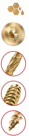 - Powłoka woskowa: specjalna powłoka woskowa nanoszona podczas procesu produkcyjnego znacząco zmniejsza moment potrzebny do wkręcania wkręta. Dzięki temu montaż jest szybszy i łatwiejszy, znacząco obniża zużycie energii co jest szczególnie istotne w narzędziach zasilanych akumulatorem.