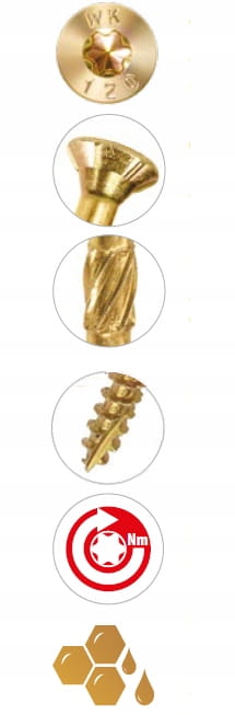 - Powłoka woskowa: specjalna powłoka woskowa nanoszona podczas procesu produkcyjnego znacząco zmniejsza moment potrzebny do wkręcania wkręta. Dzięki temu montaż jest szybszy i łatwiejszy, znacząco obniża zużycie energii co jest szczególnie istotne w narzędziach zasilanych akumulatorem;