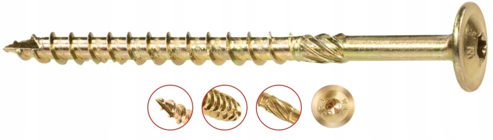 - Specjalne ostrze : Nacięcie na początku gwintu ułatwia rozpoczęcie wkręcania, oraz zapobiega pękaniu drewna.