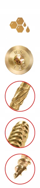 - Karby tnące : Specjalne karby tnące na gwincie przecinają włókna struktury drewna podczas wkręcania.