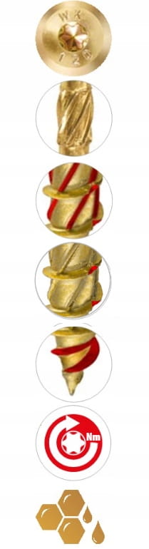 - Powłoka woskowa - Dzięki specjalnej powłoce woskowej nanoszonej podczas procesu produkcji, znacząco zmniejszył się moment wkręcania, Dzięki temu montaż jest szybszy, łatwiejszy i ogranicza zużycie energii co jest szczególnie istotne w narzędziach zasilanych akumulatorem