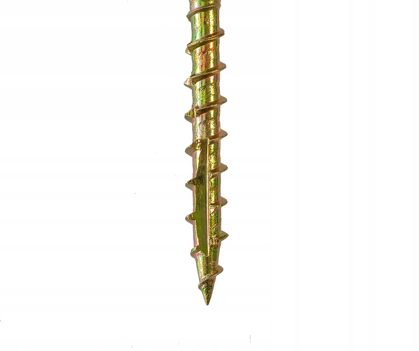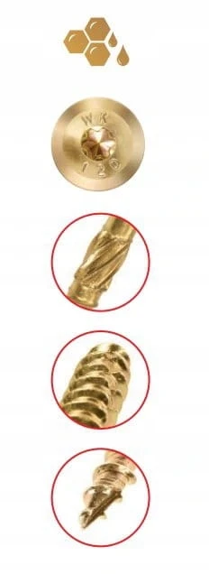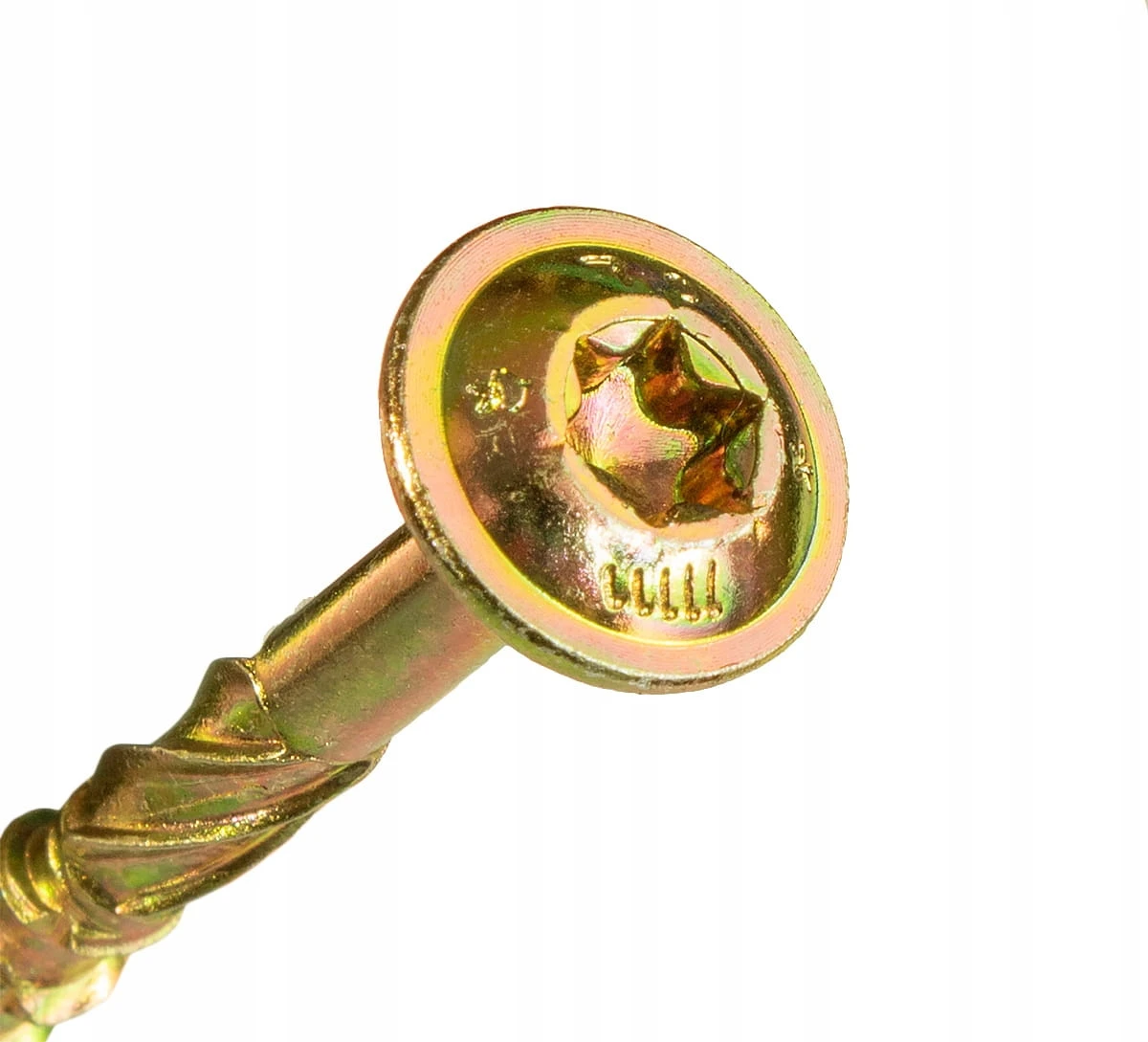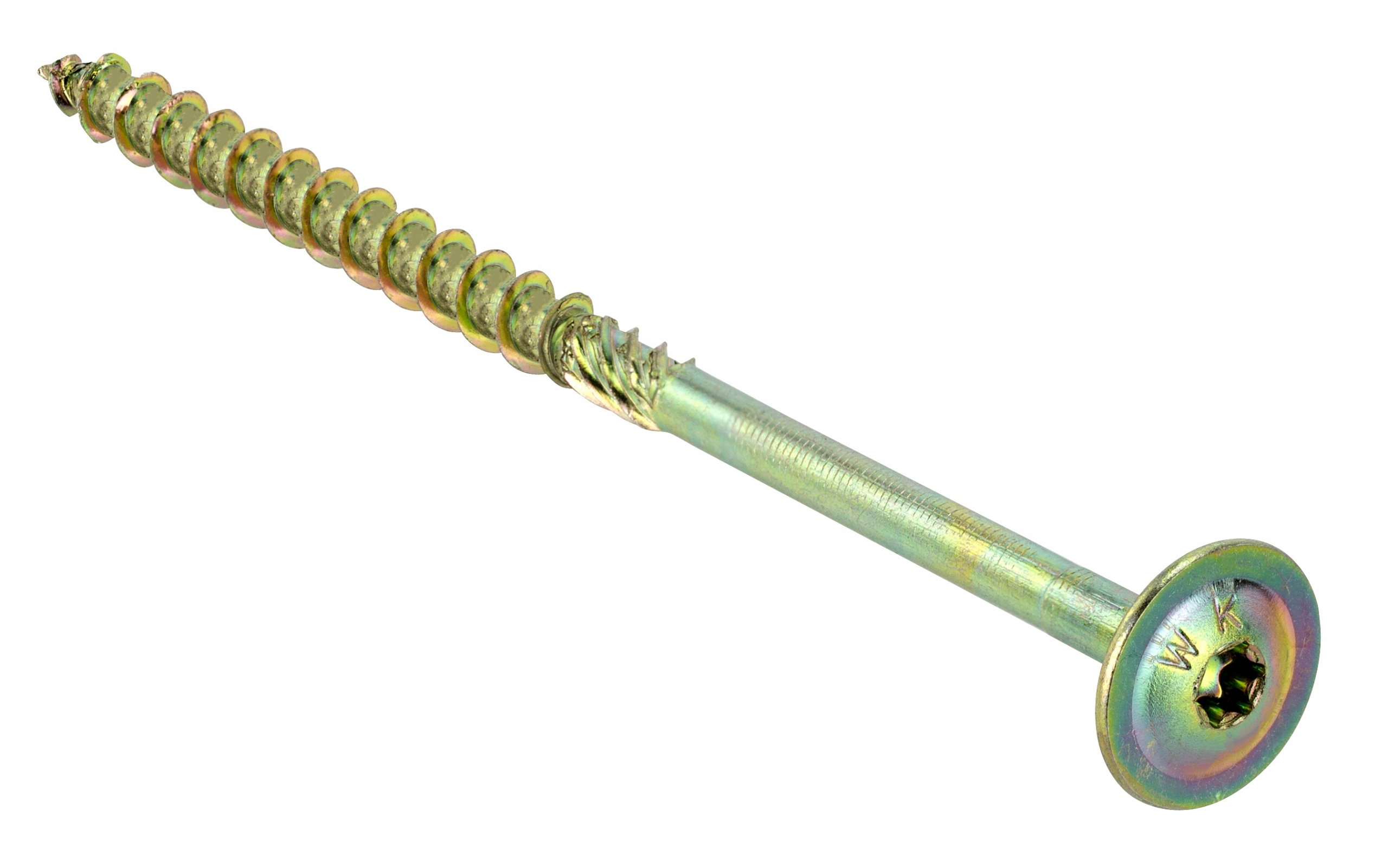 Wkręty konstrukcyjne, ciesielskie WKCP wykonane ze stali niskowęglowej pokrytej warstwą ochronną ocynku w kolorze żółtym. Posiadają łeb podkładkowy z gniazdem typu TX oraz specjalną końcówkę wiercącą przeznaczoną do połączeń w konstrukcjach drewnianych.