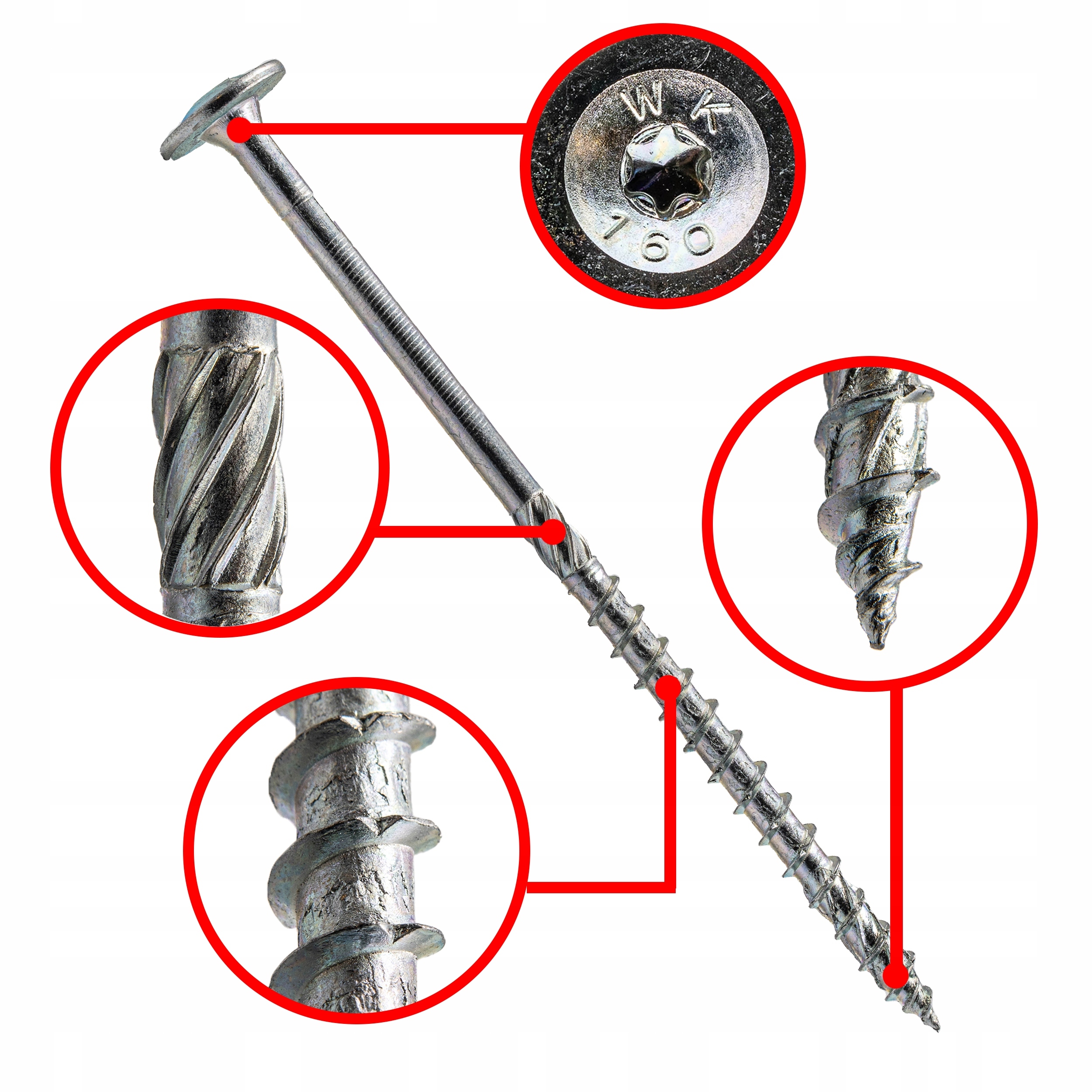 - Podwójny gwint - Dodatkowe zwoje na szpicu ułątwiają wkręcanie, pozwalają na szybsze "złapanie" drewna przy mniejszej sile docisku.