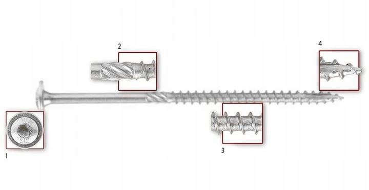 - Karby tnące - Specjalne karby tnące na gwincie przecinają włókna struktury drewna podczas wkręcania.