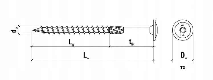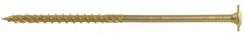 Wkręt konstrukcyjny z łbem podkładkowym i gniazdem TX do połączeń konstrukcyjnych elementów drewnianych m.in. litych, klejonych i płyt drewnopochodnych.