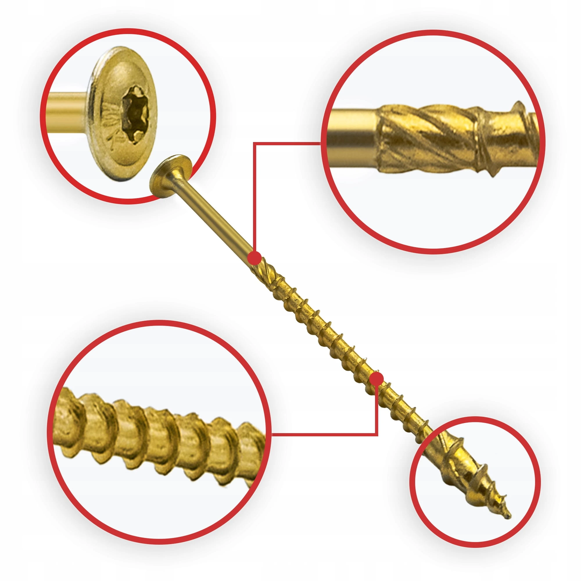 - Karby tnące - Specjalne karby tnące na gwincie przecinają włókna struktury drewna podczas wkręcania.