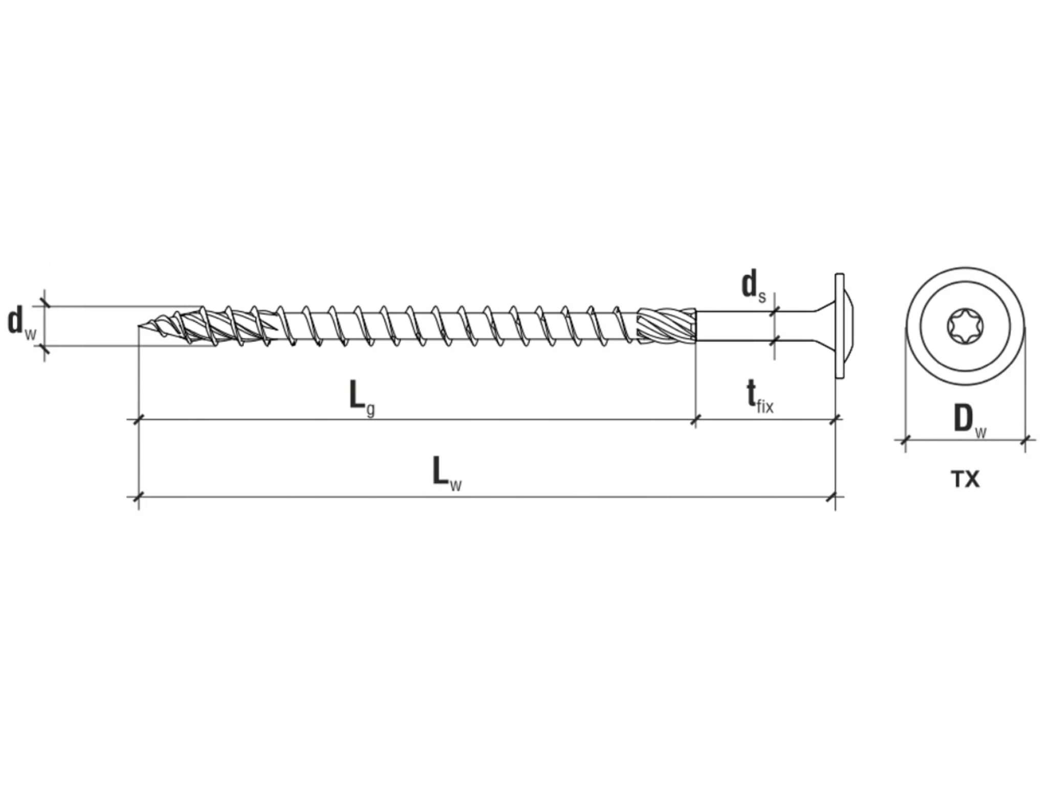 Łeb podkładkowy z gniazdem TX - Zwiększa powierzchnię docisku zapewniając wysoką wytrzymałość na przeciąganie. Gniazdo TX gwarantuje optymalne przeniesienie momentu obrotowego.