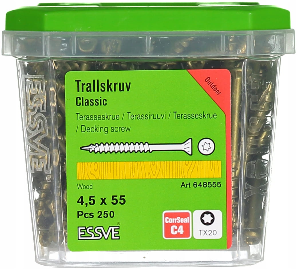 Szukasz niezawodnych wkrętów do tarasu lub konstrukcji drewnianych? ESSVE Classic to profesjonalne wkręty stworzone z myślą o trwałych i wytrzymałych połączeniach w drewnie – idealne do tarasów, ogrodzeń oraz wszelkich elementów architektury ogrodowej.