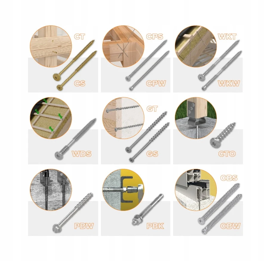 Wkręty ciesielskie przeznaczone do łączenia drewnianych elementów konstrukcyjnych. Nie wymagają nawiercania i w pełni zastępują gwoździe budowlane. Mają działanie dociągające. Dostępne są w długościach do 400 mm, a oznaczenie długości znajduje się na główce wkrętu, ułatwiając pracę. Głębokie gniazdo TORX pozwala na lepsze przeniesienie siły wkręcającej i zapobiega wyskakiwaniu bitu. Wkręty ciesielskie CS doskonale sprawdzą się w budownictwie drewnianym i stolarstwie, konstrukcjach szkieletowych, konstrukcjach hal itp.