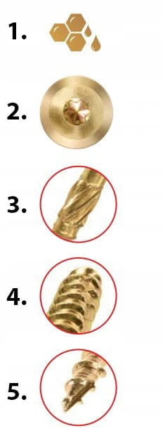 1. Powłoka woskowa. Specjalna powłoka woskowa nanoszona podczas procesu produkcji, znacząco zmniejsza moment wkręcania. Dzięki temu montaż jest szybszy, łatwiejszy i ogranicza zużycie energii co jest szczególnie istotne w narzędziach zasilanych akumulatorem