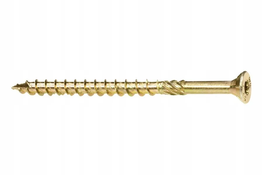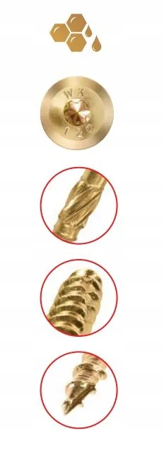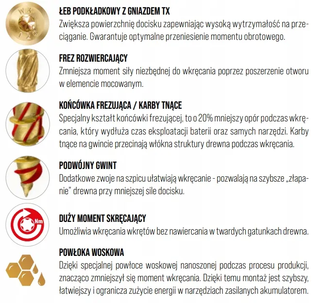- Karby tnące - Specjalne karby tnące na gwincie przecinają włókna struktury drewna podczas wkręcania.