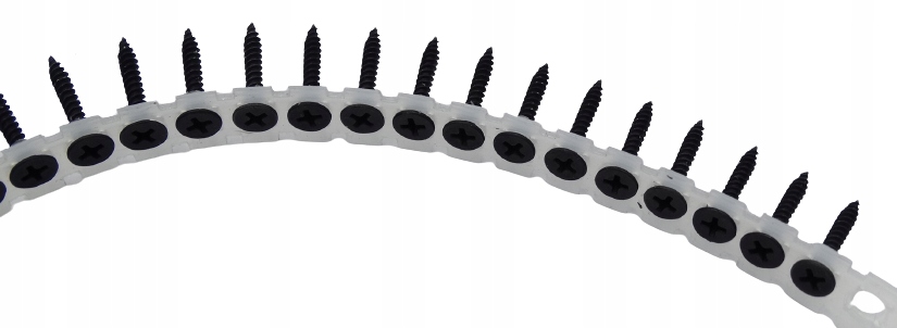 - Wkręty są rozmieszczone na taśmie, co umożliwia szybki i wygodny montaż przy użyciu wkrętarek automatycznych.