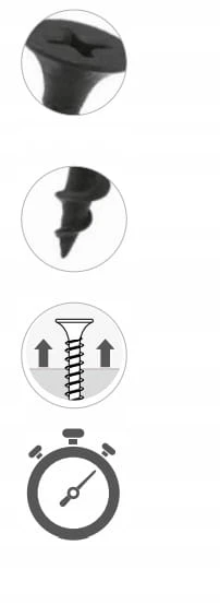 Krótki czas wkręcania- specjalny profil gwintu minimalizujący czas wkręcenia: 2,5 razy krótszy czas wkręcania od wymagań normy