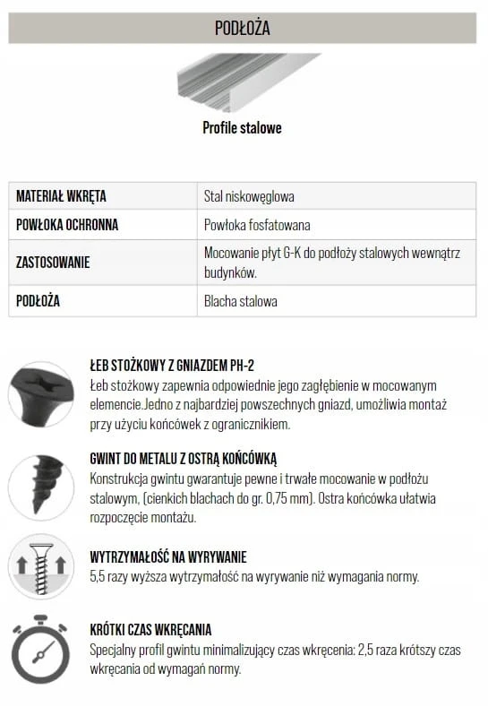 Są to specjalne czarne wkręty fosfatowane, które doskonale nadają się do mocowania płyt gipsowo-kartonowych do profili metalowych, w systemach suchej zabudowy wnętrz.