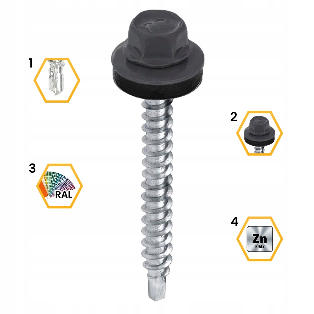 Wkręt samowiercący wykonany jest ze stali węglowej utwardzonej powierzchniowo w powłoce cynkowej. Wkręt posiada łeb sześciokątny typu SW, trzpień z gwintem do drewna, ostrze wykonane w kształcie wiertła oraz podkładkę z uszczelniającym EPDM. Łby wkrętów samowiercących mogą być pokryte powłoką lakierniczą wg palety RAL, która jest trwała, odporna na uszkodzenia mechaniczne oraz promieniowanie UV, co gwarantuje trwałość i niezmienność koloru.