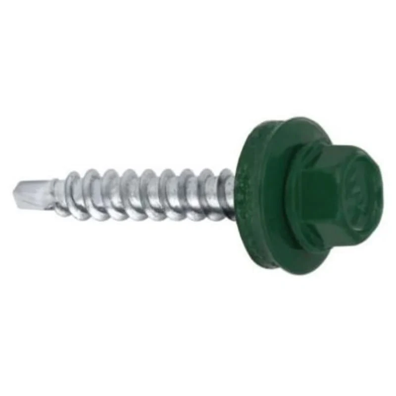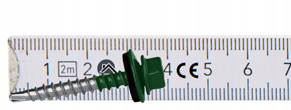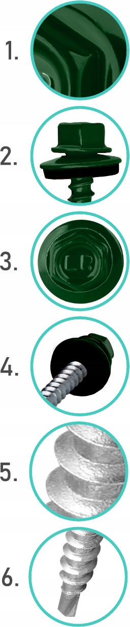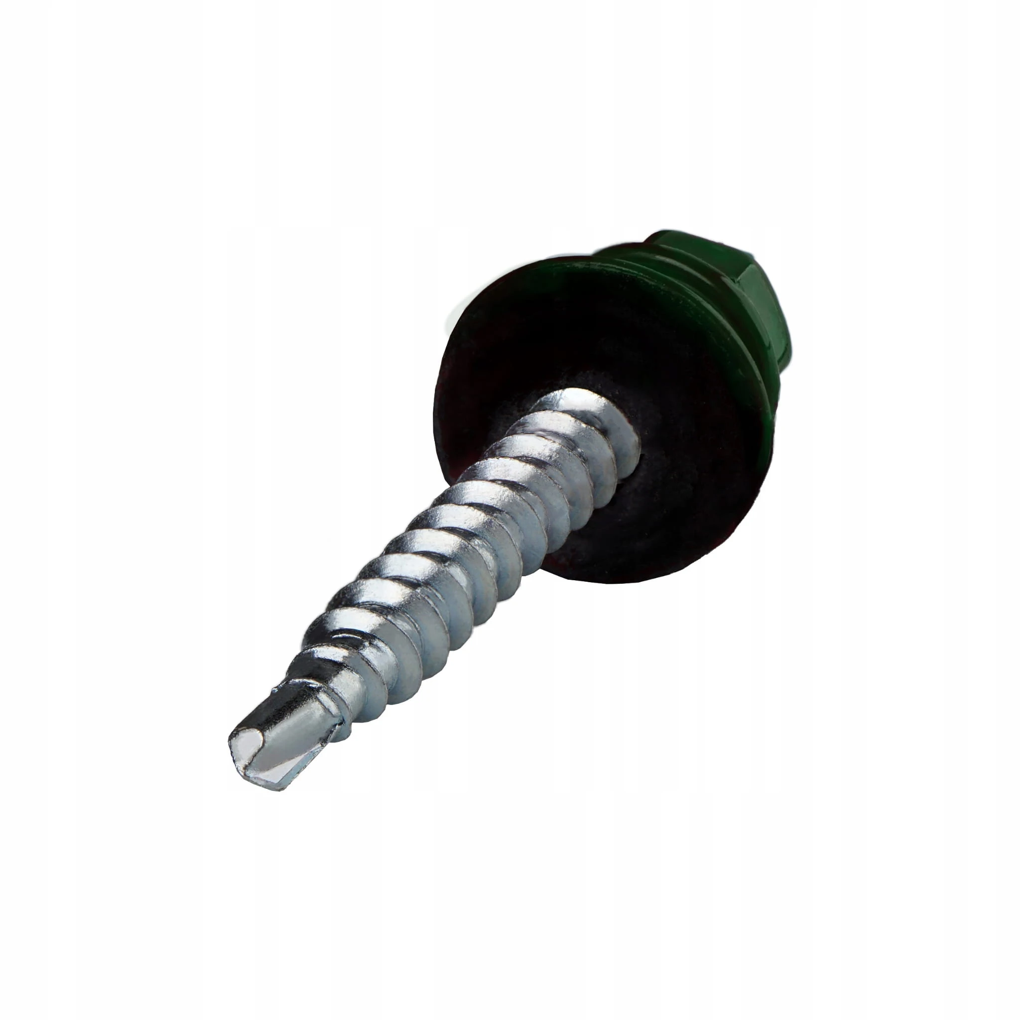Łączniki samowiercące gwintujące wykonane ze stali węglowej utwardzonej powierzchniowo, ocynkowane elektrolitycznie, ze zredukowanym punktem wiercącym, gwintem do drewna oraz z łbem sześciokątnym, ze zmontowaną podkładką stalową z nawulkanizowanym EPDM.