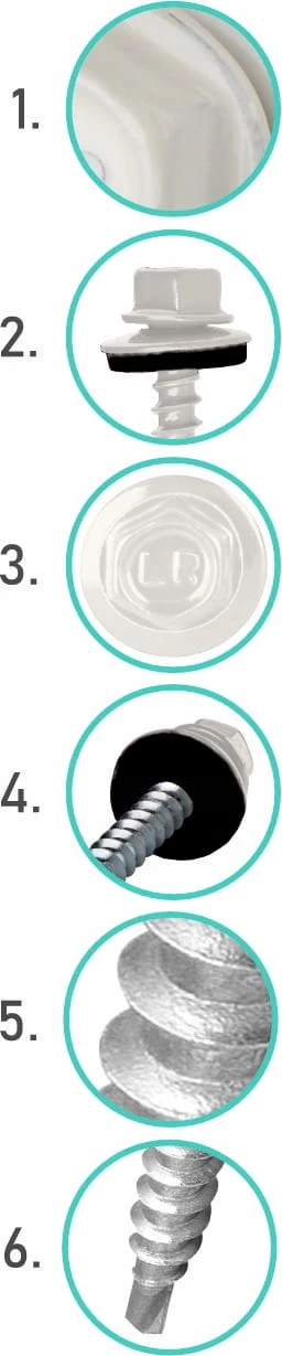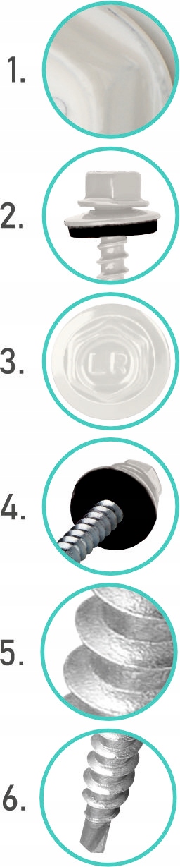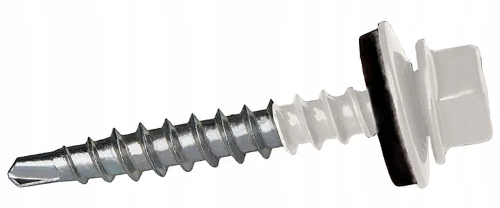 Łączniki samowiercące gwintujące wykonane ze stali węglowej utwardzonej powierzchniowo, ocynkowane elektrolitycznie, ze zredukowanym punktem wiercącym, gwintem do drewna oraz z łbem sześciokątnym, ze zmontowaną podkładką stalową z nawulkanizowanym EPDM.