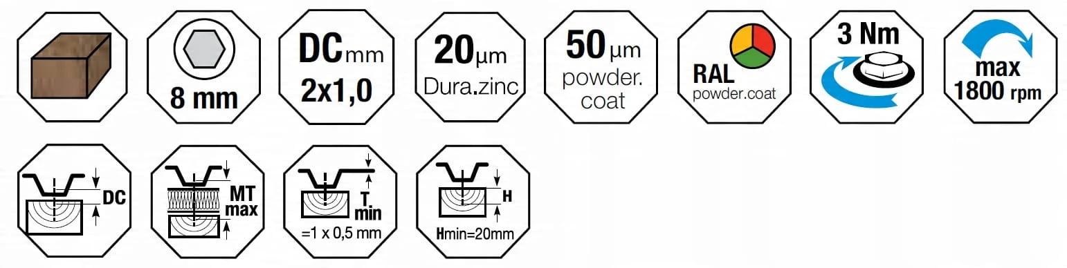 Łączniki samowiercące gwintujące wykonane ze stali węglowej utwardzonej powierzchniowo, ocynkowane elektrolitycznie, ze zredukowanym punktem wiercącym oraz z łbem sześciokątnym, ze zmontowaną podkładką stalową z nawulkanizowanym EPDM.